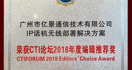 12月20日,在通信信息行業(yè)網(wǎng)站CTI論壇舉辦的年度技術(shù)評(píng)選活動(dòng)上,億景IP話機(jī)無(wú)線部署解決方案榮獲“2018年度編輯推薦獎(jiǎng)”。12月20日,在通信信息行業(yè)網(wǎng)站CTI論壇舉辦的年度技術(shù)評(píng)選活動(dòng)上,億景IP話機(jī)無(wú)線部署解決方案榮獲“2018年度編輯推薦獎(jiǎng)”。